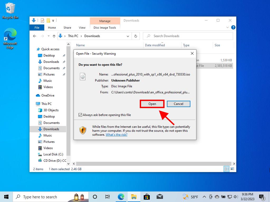 - Once you have downloaded the Office 2010 .iso file, locate the file and double-click on it. In the dialogue box, click on Open.