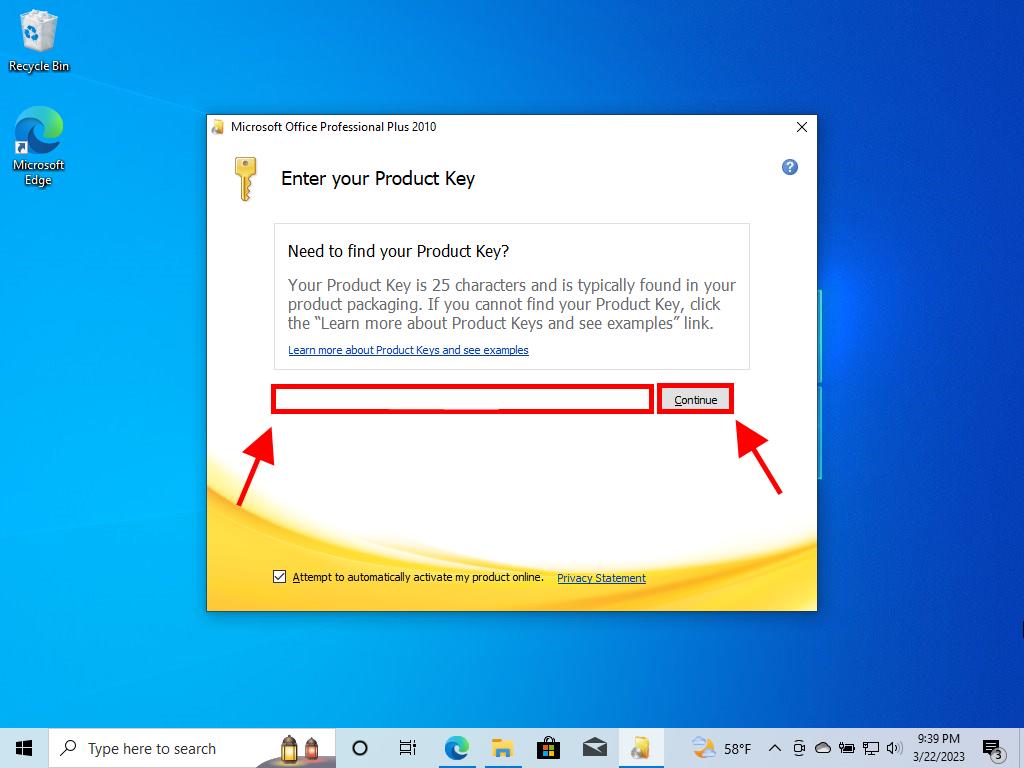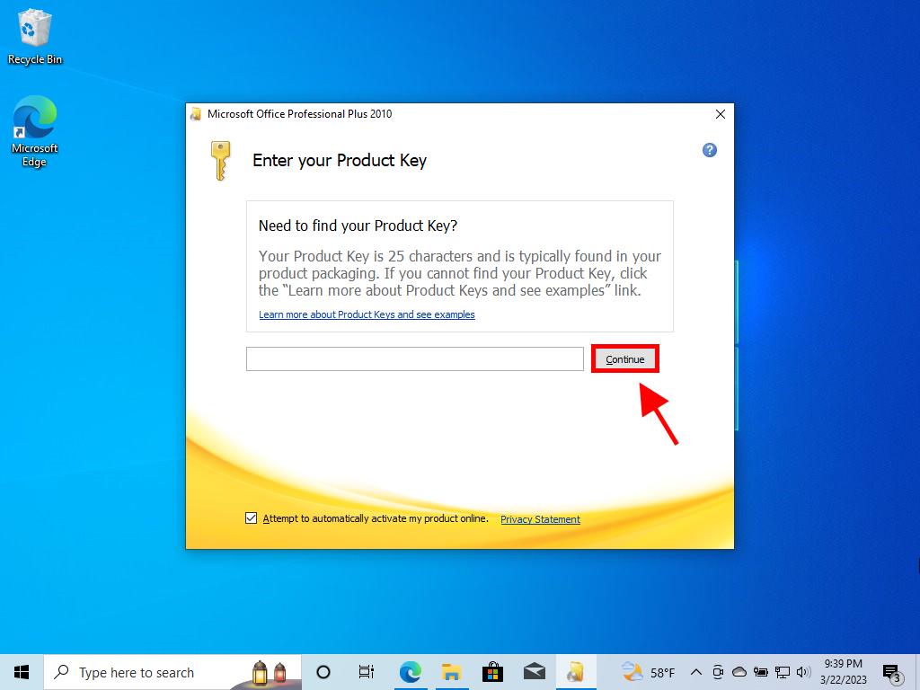 - Enter your Office product key and click Continue.