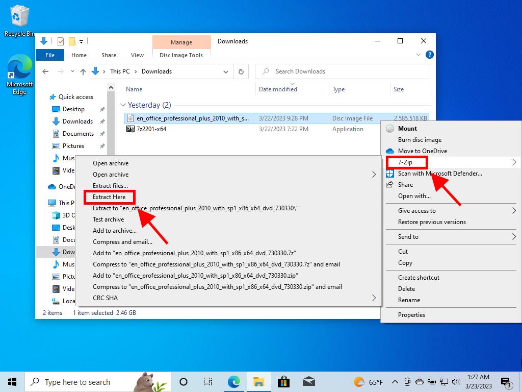 - Once you have downloaded the Office 2010 .iso file, locate the file and right-click on it. Select 7-Zip and click on Extract here.