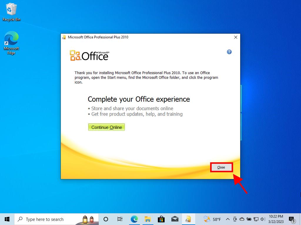 - Next, click on Close, and you will have Office 2010 installed.