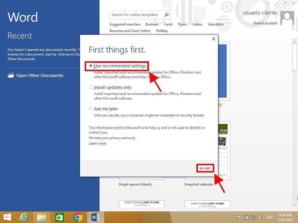 - Select Use recommended settings and click on Accept.