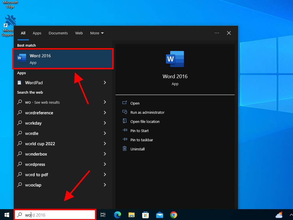 - In the search box located in the bottom left corner of the desktop, type the name of an Office application, such as Word, Excel, or PowerPoint (in this article, we will use Word as a reference, but the process is the same regardless of the application used). Click on Word.