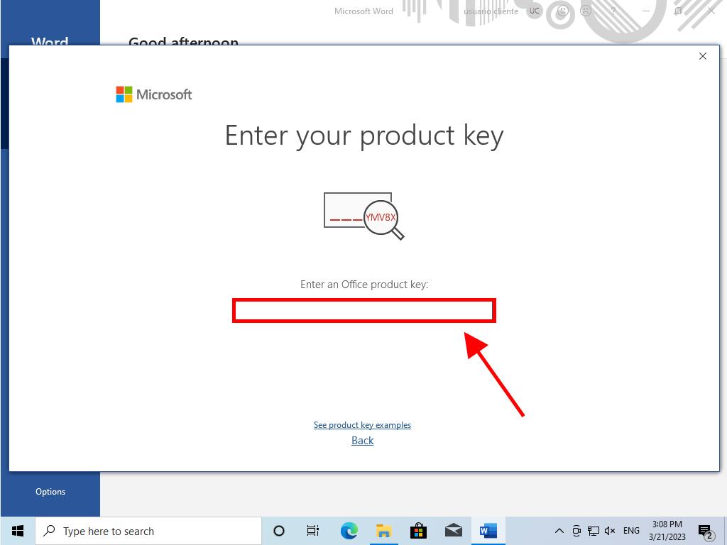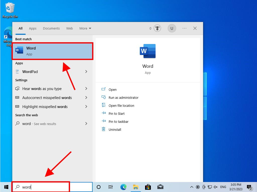 - In the search box located at the bottom left of the desktop, type the name of an Office application, whether it's Word, Excel or PowerPoint (in this article, we will use Word as a reference, but the process is the same regardless of the application you use). Click on Word.