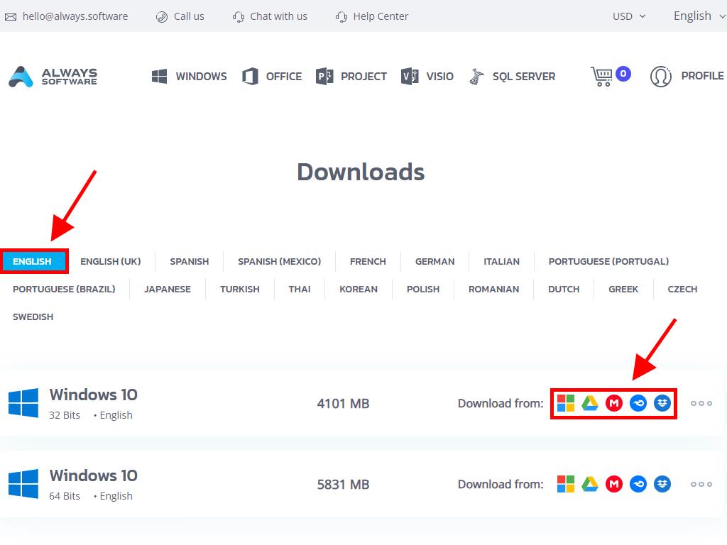 In the Downloads section, choose the language and download server that is available and most convenient for you (Microsoft / Google Drive / Mega / MediaFire / Dropbox).