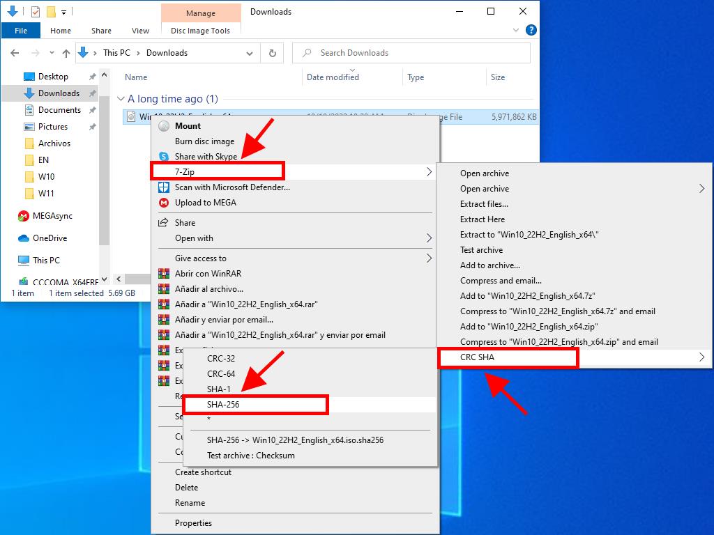 - Find the Windows 10 .iso file you've already downloaded, right-click on it and then select 7-Zip > CRC-SHA > SHA-256.