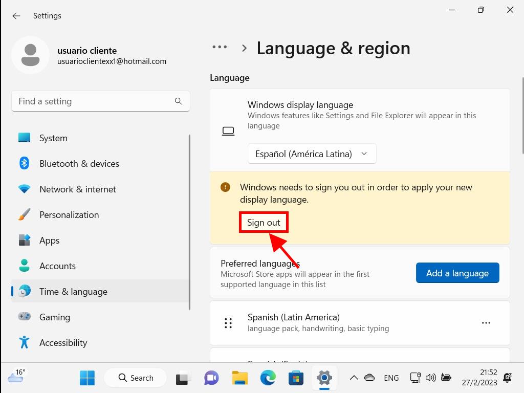 - Once the language pack has downloaded, click on Sign out to apply the changes.