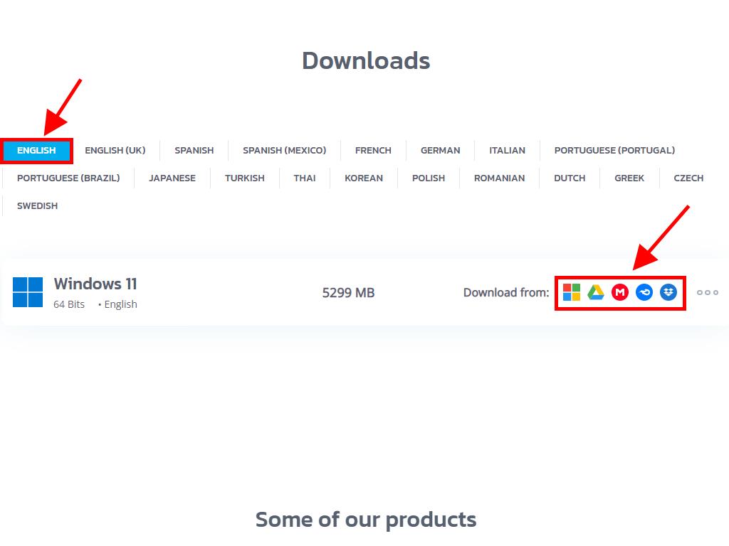 In the Downloads section, select the language and download server that's available and most convenient for you (Microsoft / Google Drive / Mega / MediaFire / Dropbox).