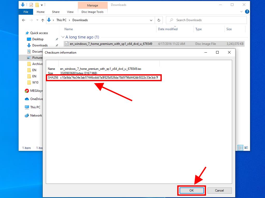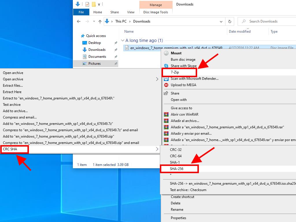 - Find the Windows 7 .iso file you have already downloaded. Right-click on it and select 7-Zip > CRC-SHA > SHA-256.