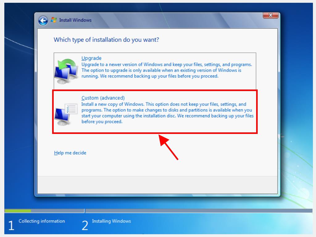 - In the following box, select the drive where you want to install Windows 7. Click Next.
