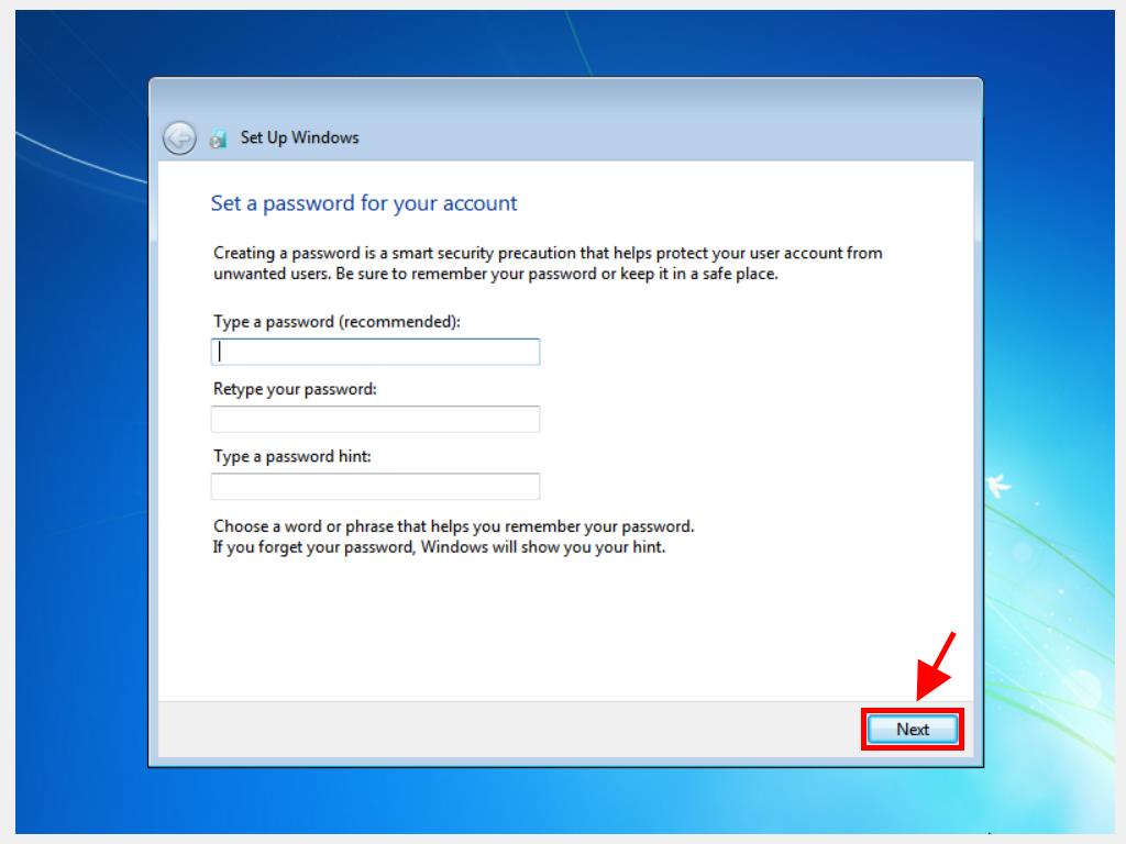 - Set a password for your account. You can enter an easy-to-remember password or leave it blank and click on Next.