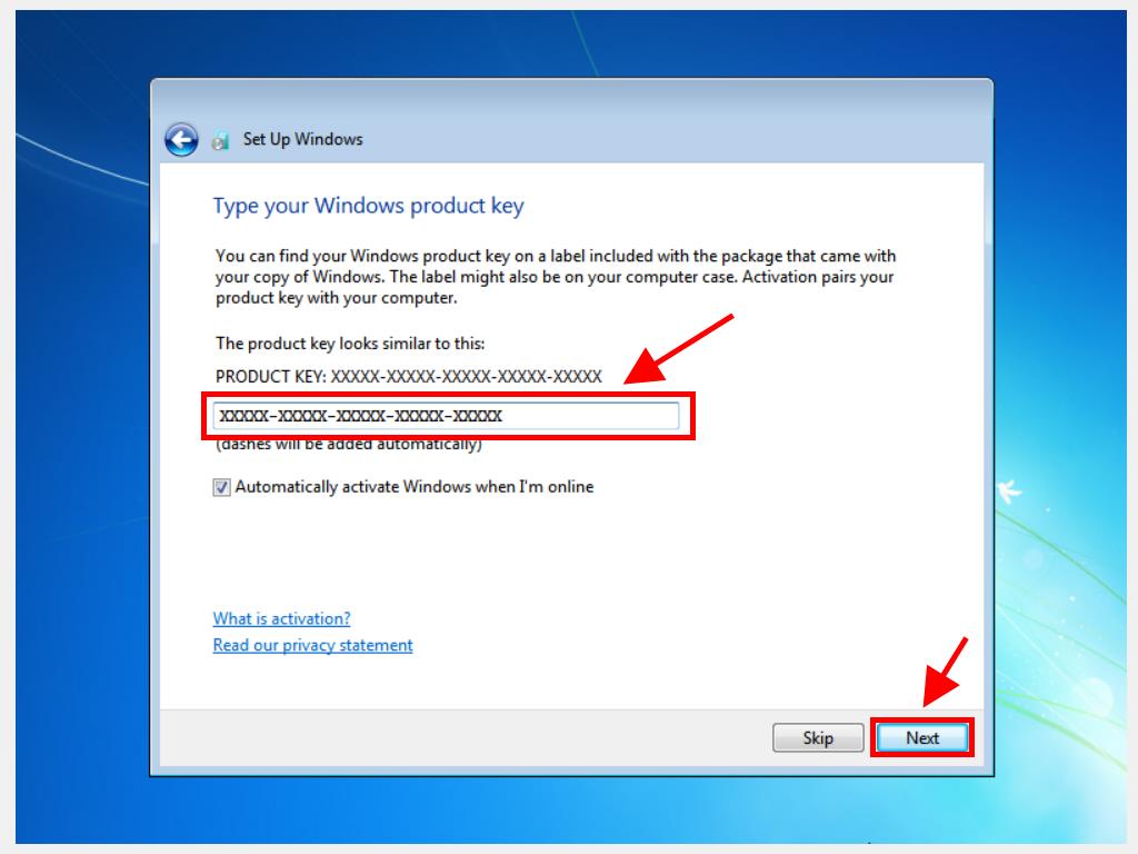 Note: We recommend entering the product key at this stage to install the correct edition of Windows 7, as skipping it may result in another edition being installed.