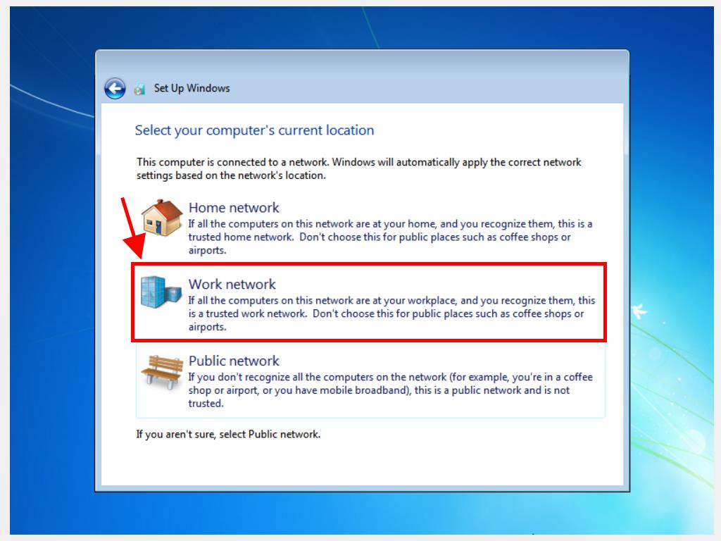 - On the Network Settings page, choose the one that best suits your needs or a standard network configuration. Click on Work network.