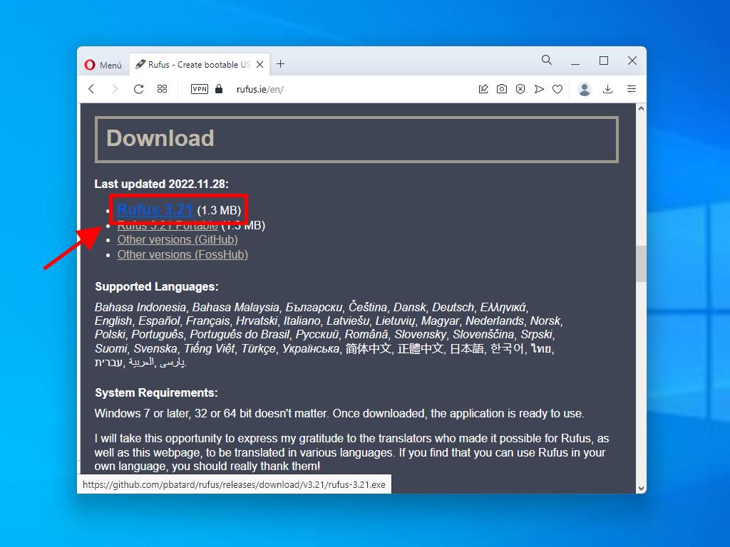 - Scroll down and download the most up-to-date version of Rufus in the Download section.
