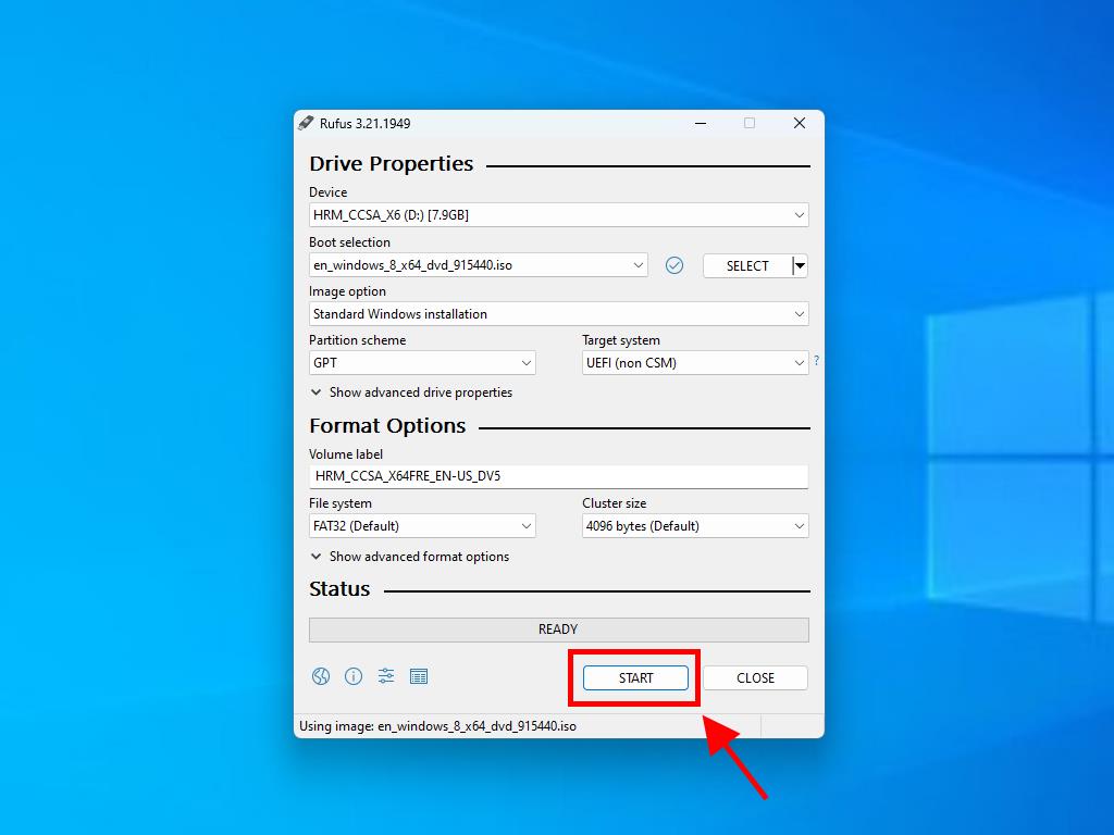- Finally, click Start and wait for the programme to create the bootable USB drive.