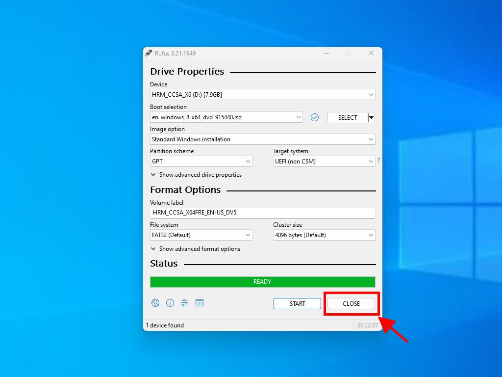 - Once the configuration is complete (progress bar at 100%), click Close and it will be ready to install Windows 8.