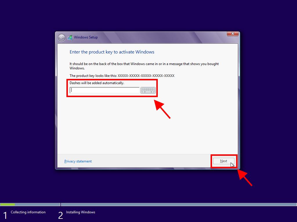 - Enter the product key to activate Windows 8 and click Next.