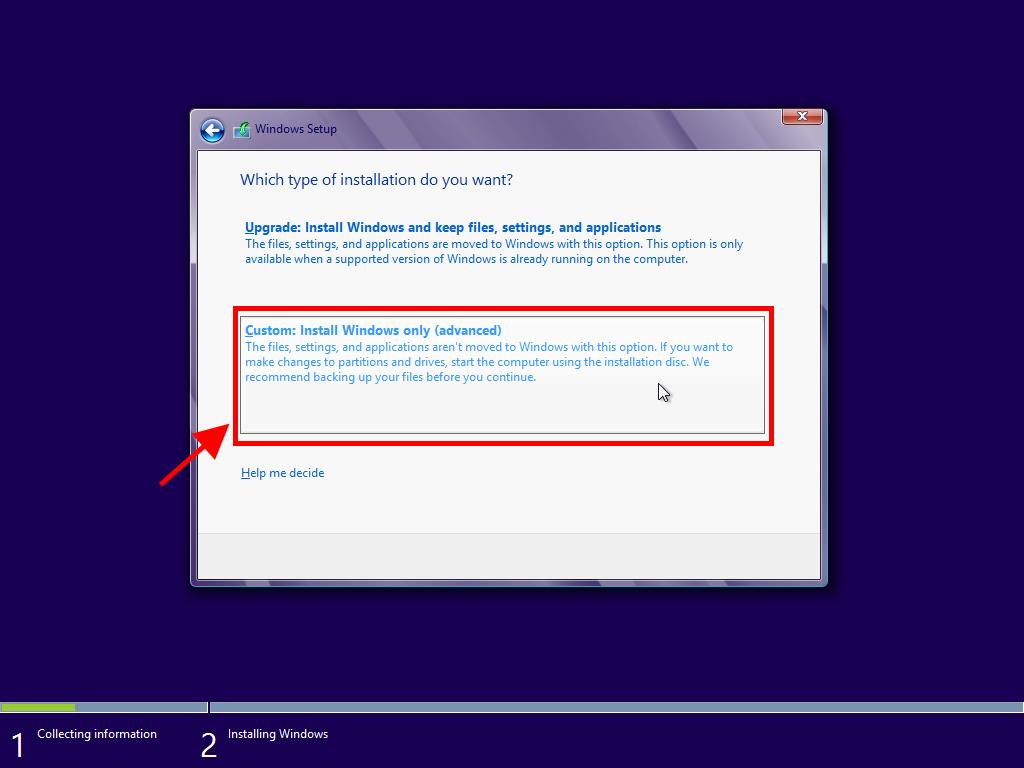 - On the next screen, select Custom: Install Windows only (advanced).