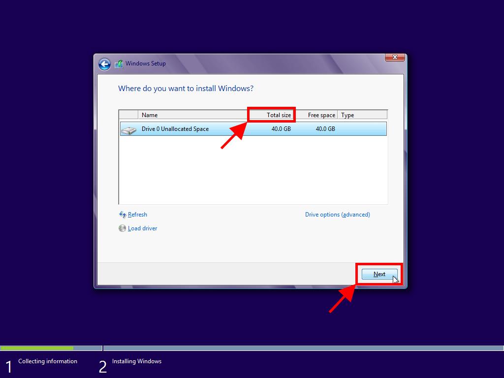 - In the following box, select the disk drive where you want to install Windows 8 and click Next.