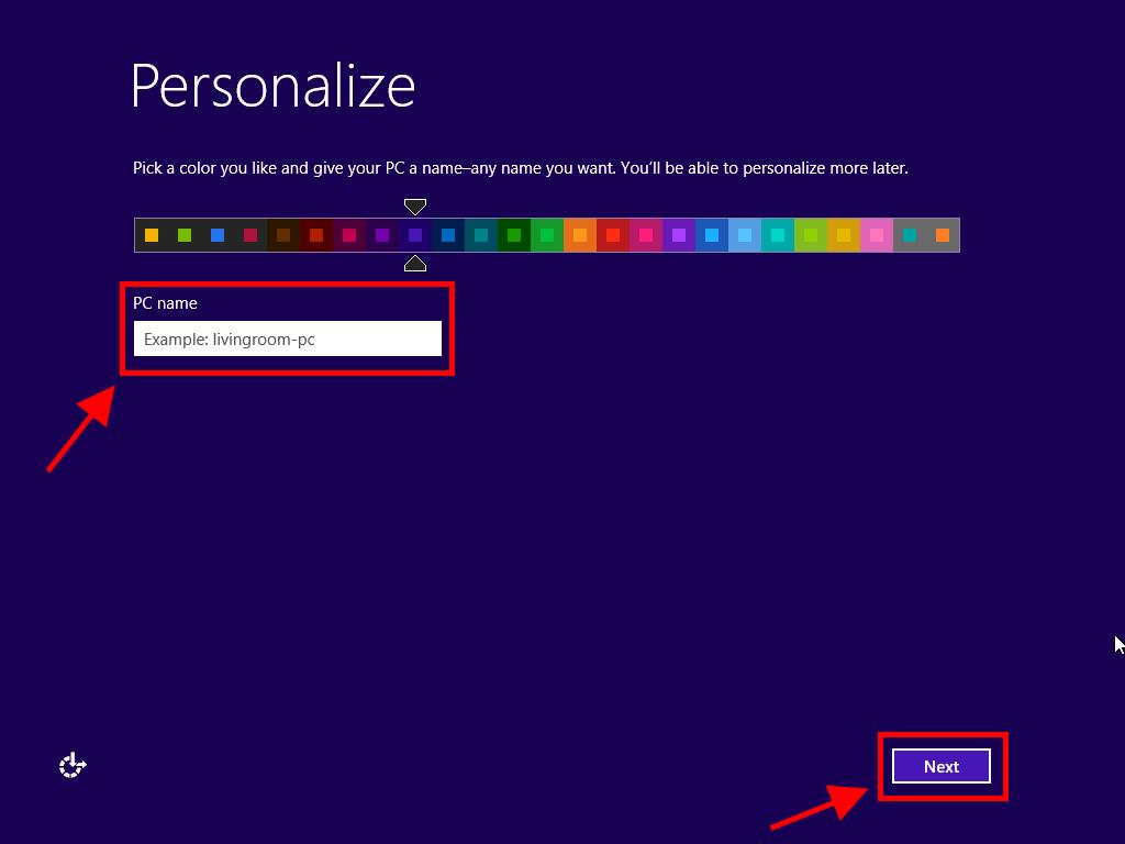 - After several restarts, you should personalise your PC. You can choose the colour you want Windows to appear in and you can name your PC. Click Next.
