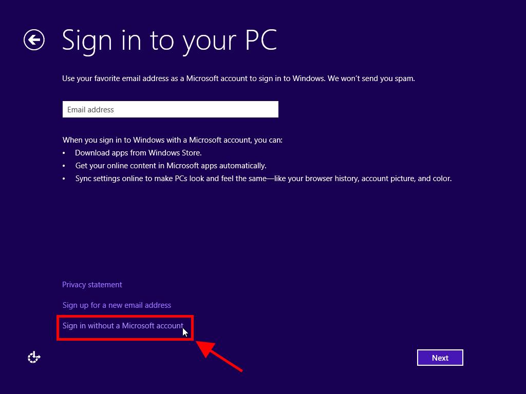 Note: The following process corresponds to Sign in without a Microsoft account.