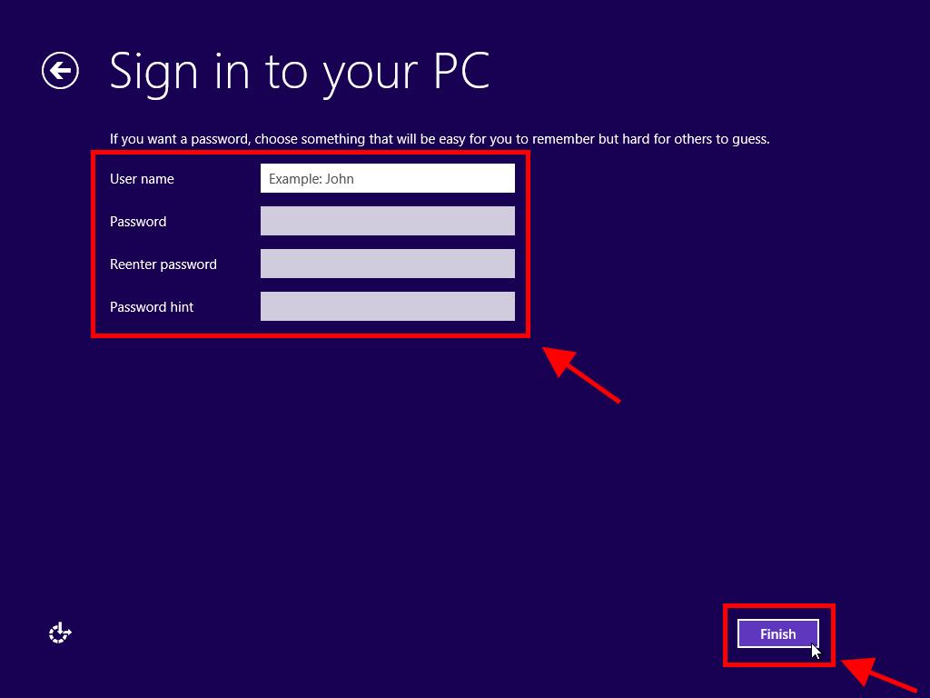 - In the next box, enter a username, login password, and click Finish.