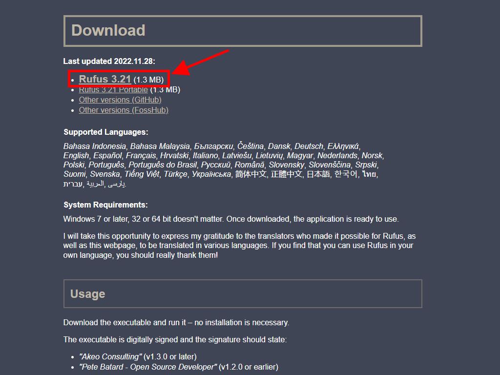 - Scroll down and download the most up-to-date version of Rufus in the Download section.