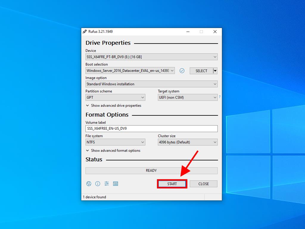 After downloading the installation file (Windows Server 2016 .iso), create a bootable USB (pendrive) to perform the installation.