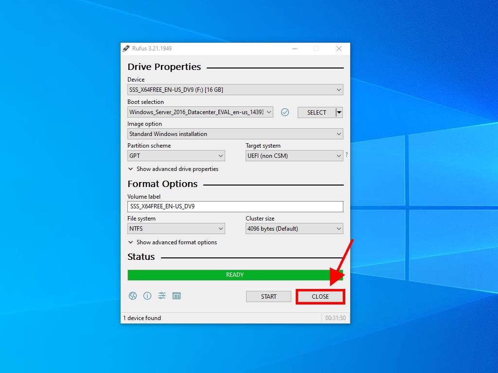 - Once the setup is complete (progress bar shows Ready), click Close and it's all set to install Windows Server 2016.