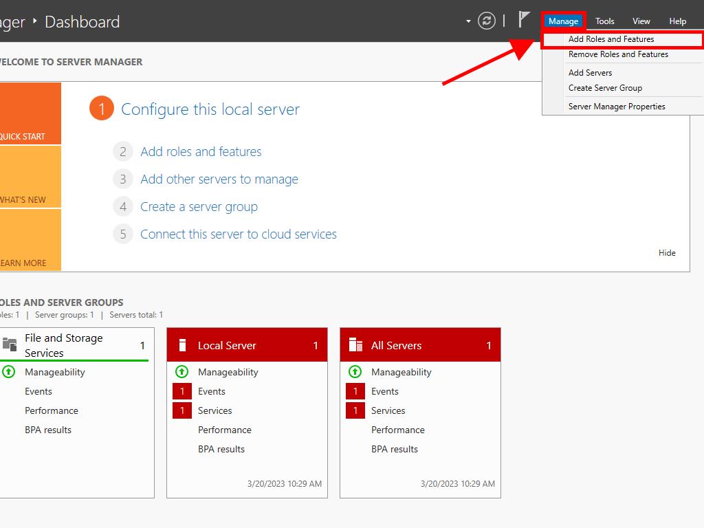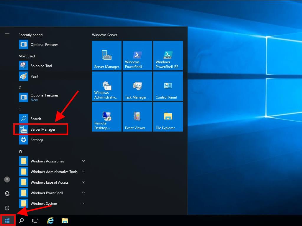 - Open the Server Manager: To do this, click on Windows and then Server Manager.