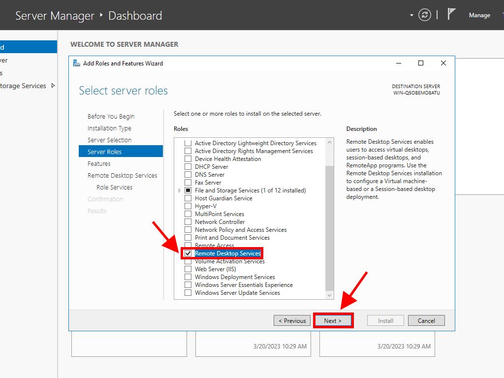- On the Select server roles page, check the box for Remote Desktop Services and click Next.