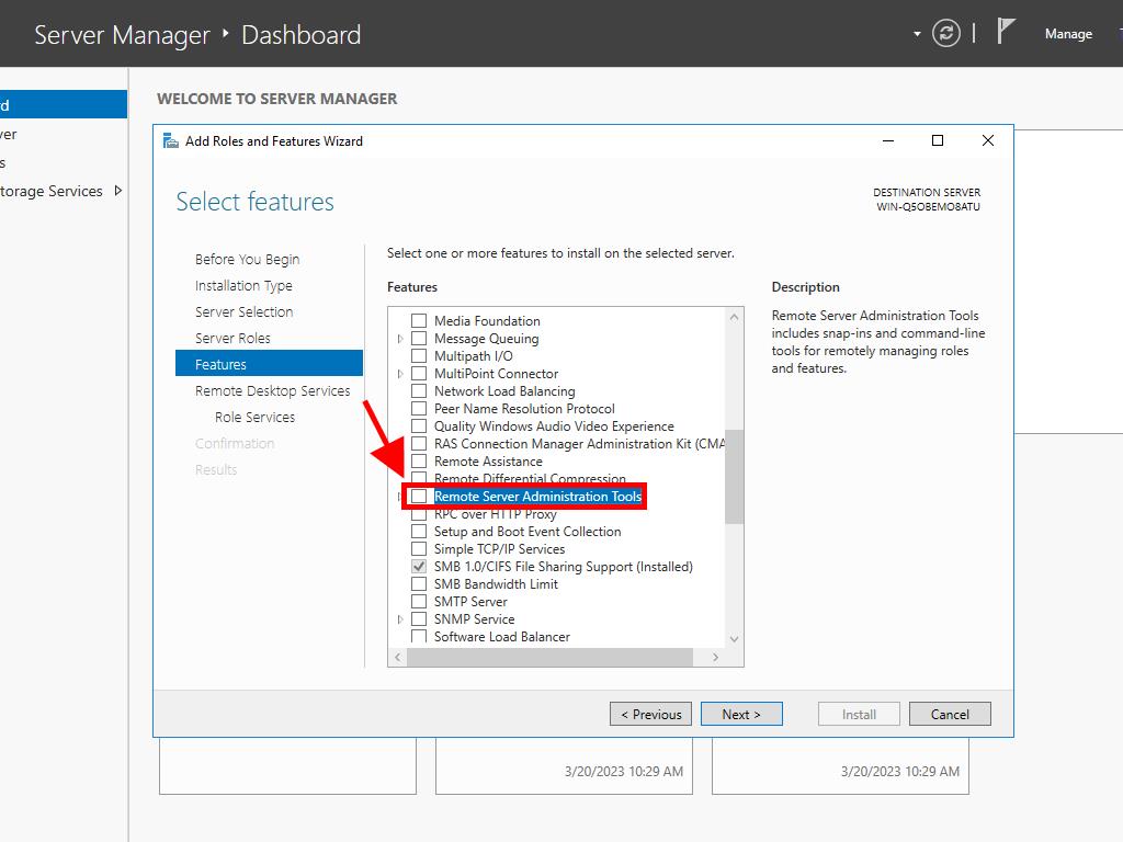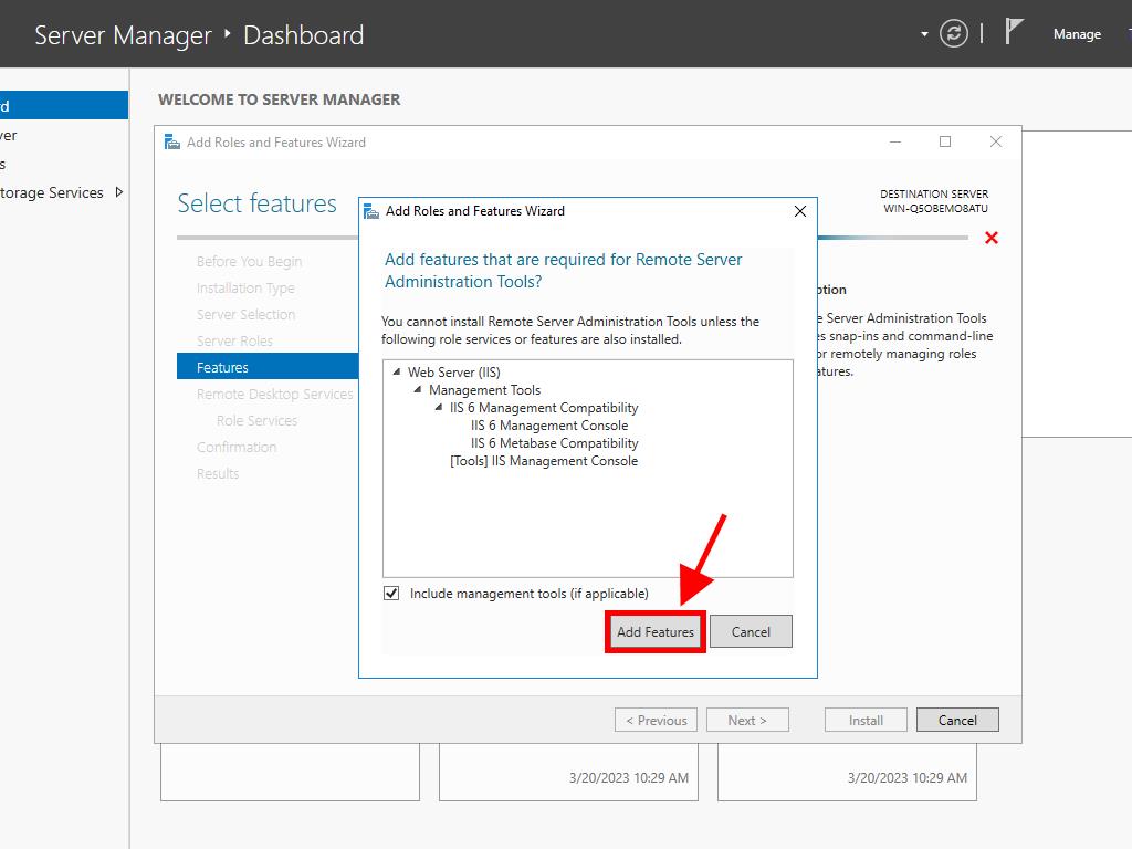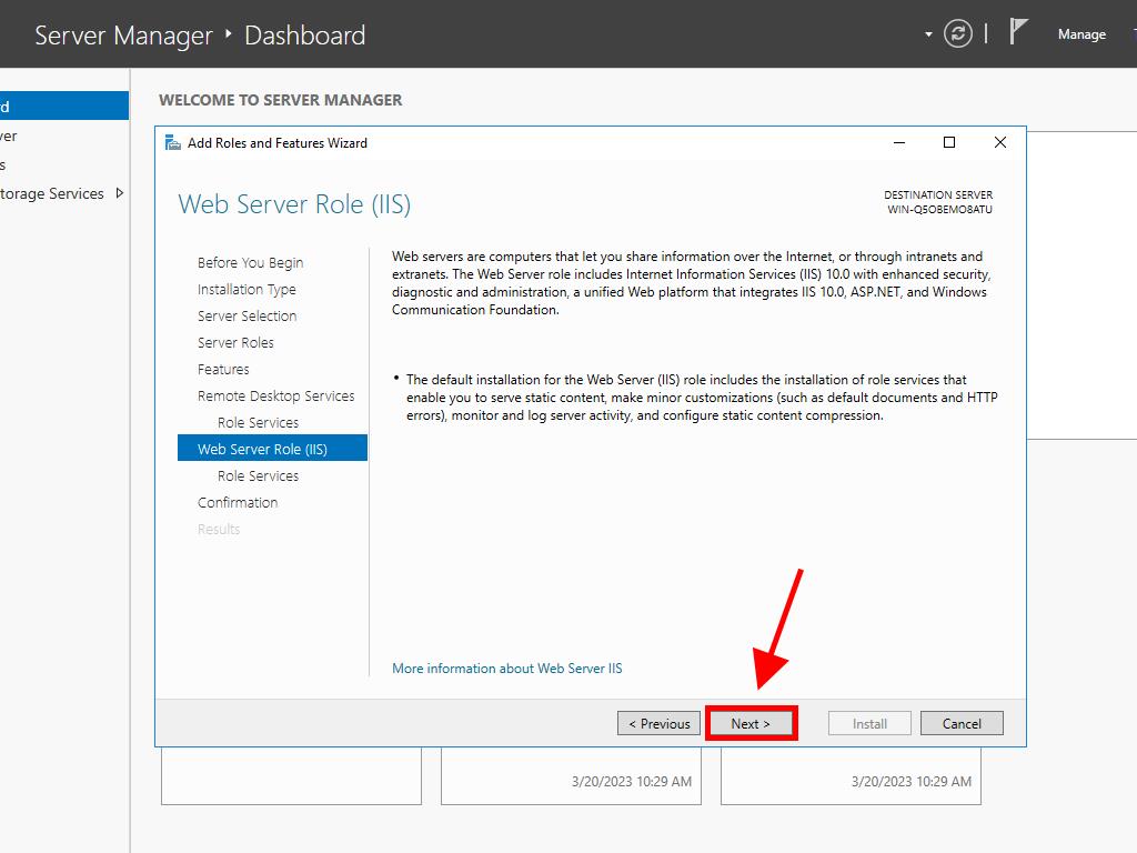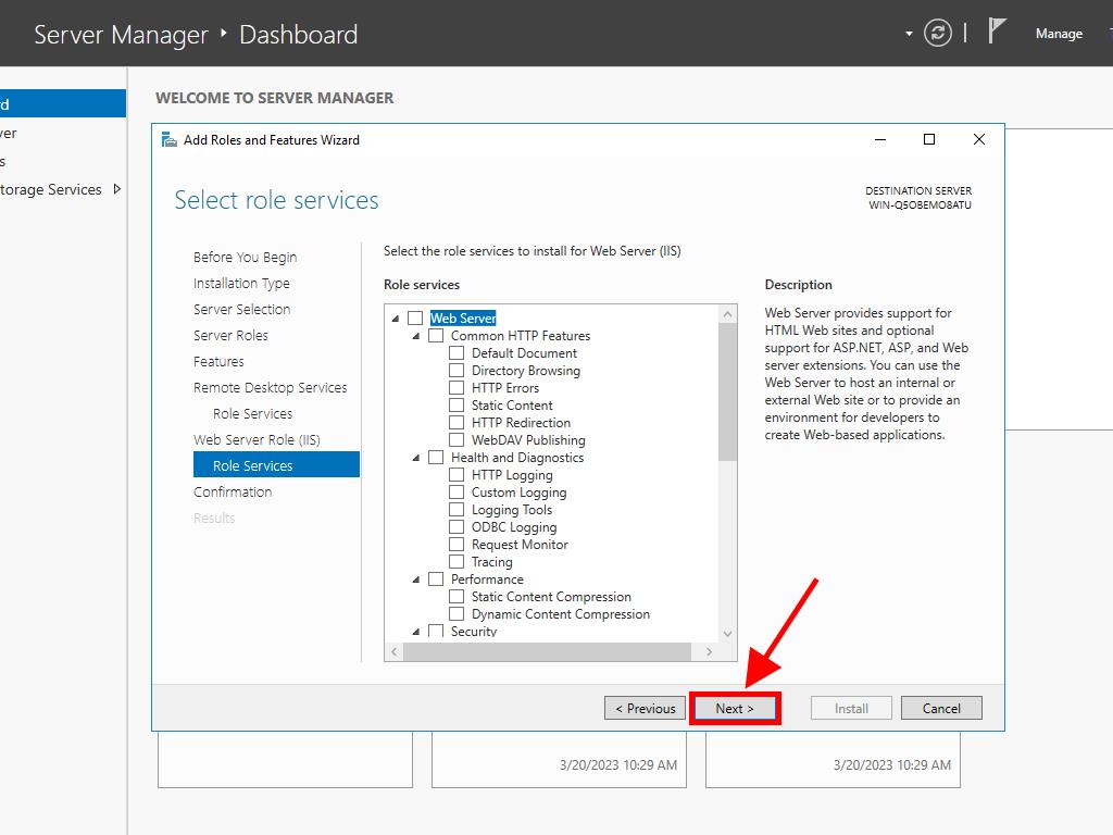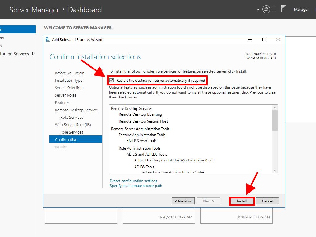 - In the following image, tick the box for Automatically restart the server and click Install. Wait for the roles to be installed.