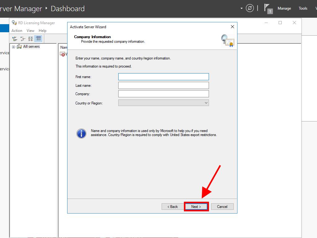 - Enter the requested information (first name, last name, region, and company name). Click Next.