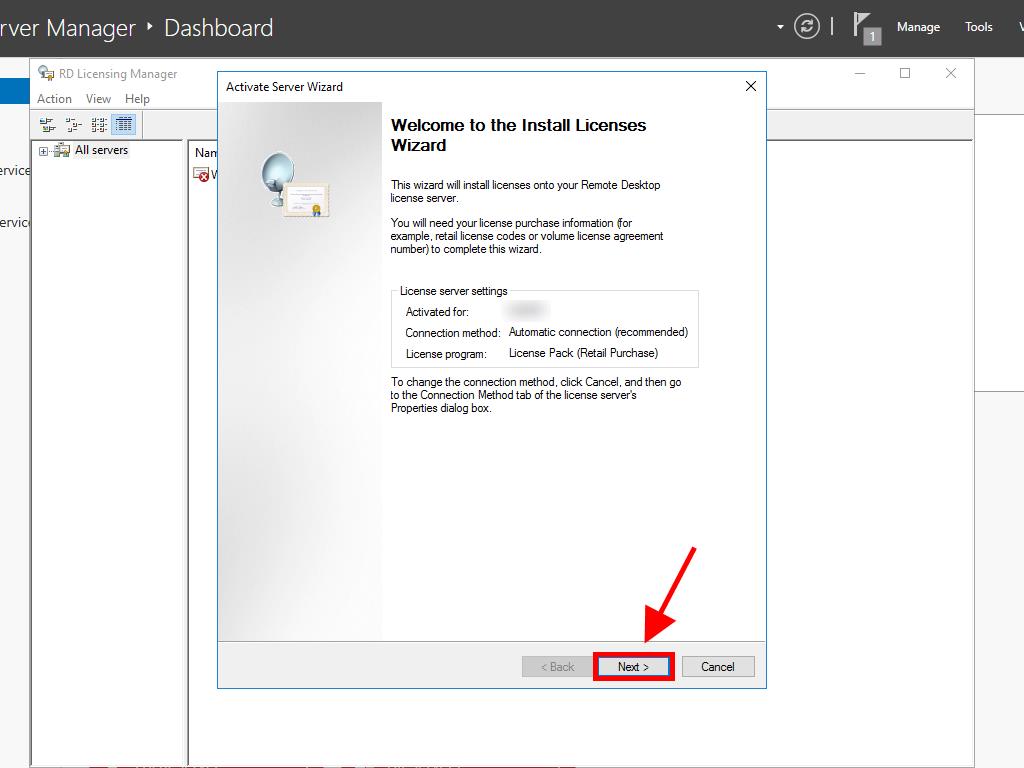 - You have completed the licensing server activation. Now you will start installing the licenses. Click Next.