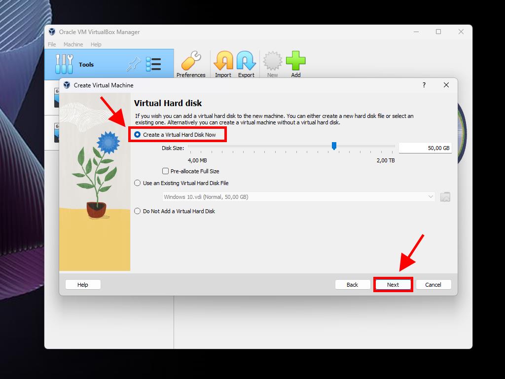 - Click on the option to Create a Virtual Hard Disk Now (use a minimum of 50 GB for proper operation). Then click Next.