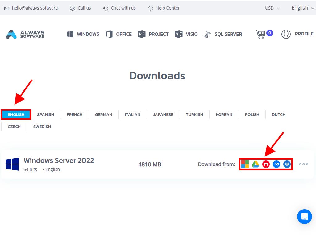 In the Downloads section, choose the language and download server that's available and most convenient for you (Microsoft / Google Drive / Mega / MediaFire / Dropbox).