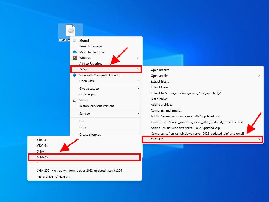 - Find the Windows Server 2022 .iso file you've already downloaded. Right-click on it and then select 7-Zip > CRC-SHA > SHA-256.