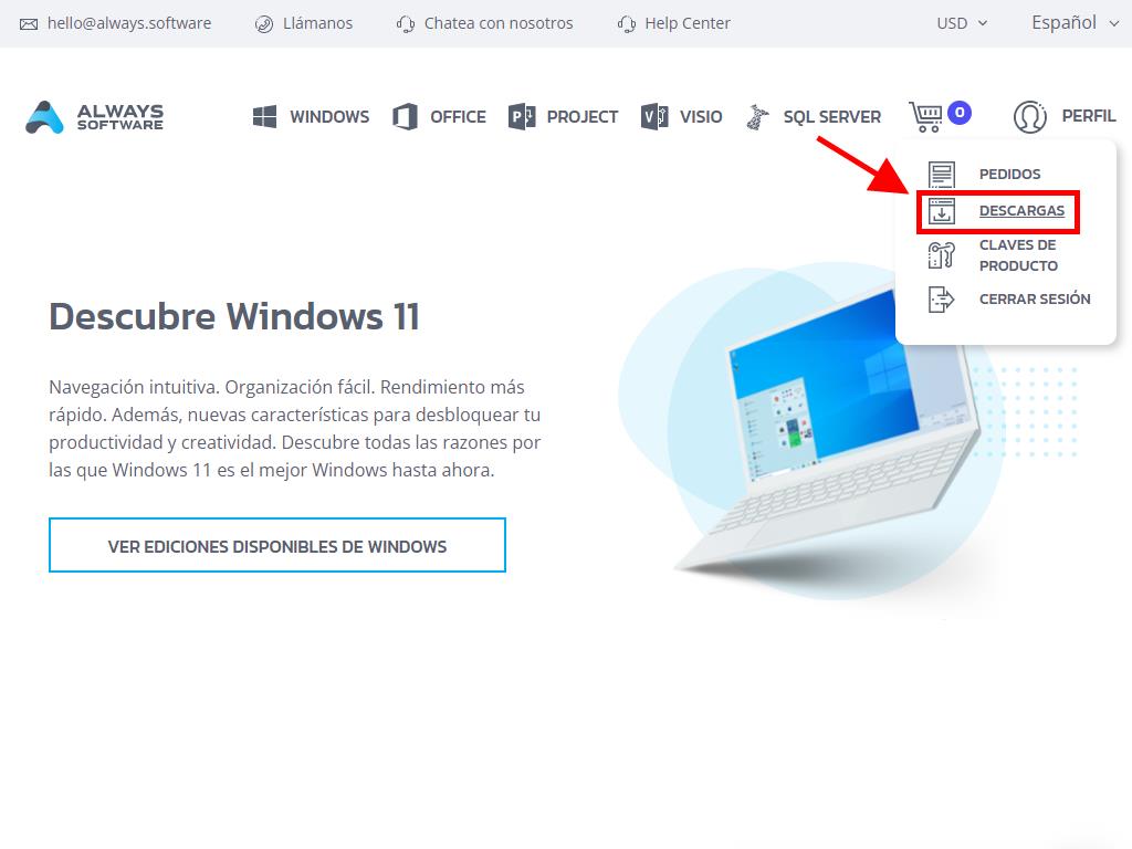Para obtener tu producto, dirígete a la sección de tu cuenta en nuestro sitio web en la esquina superior derecha. Con el cursor encima de Perfil (sin hacer clic) se te abrirá un menú desplegable.