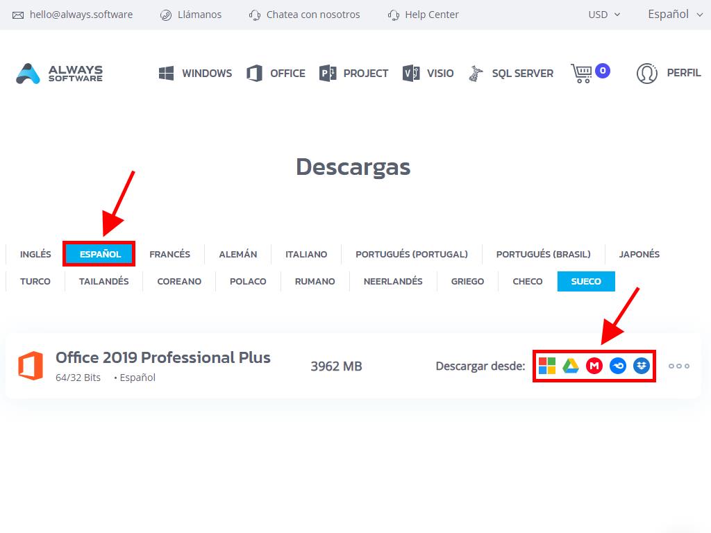 En la sección Descargas, selecciona el idioma y el servidor de descarga que esté disponible y que más te convenga (Microsoft / Google Drive / Mega / MediaFire / Dropbox).