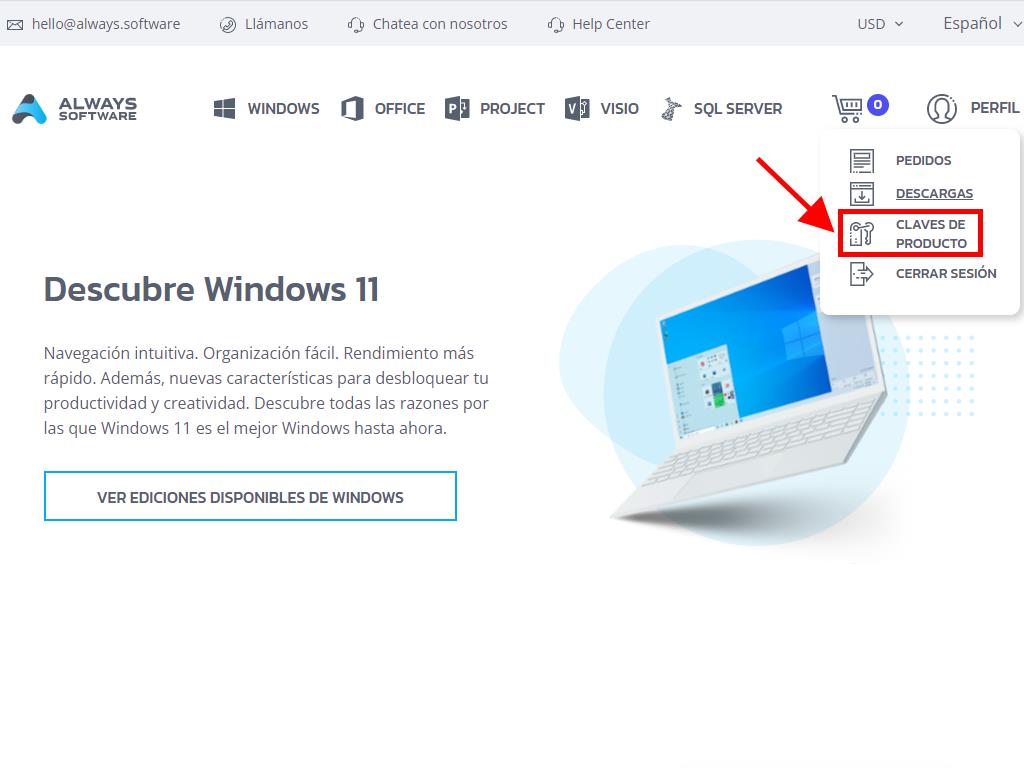 Dirígete a la sección de tu cuenta en nuestro sitio web. Con el cursor encima de Perfil (sin hacer clic) se te abrirá un menú desplegable. Selecciona Claves de Producto.