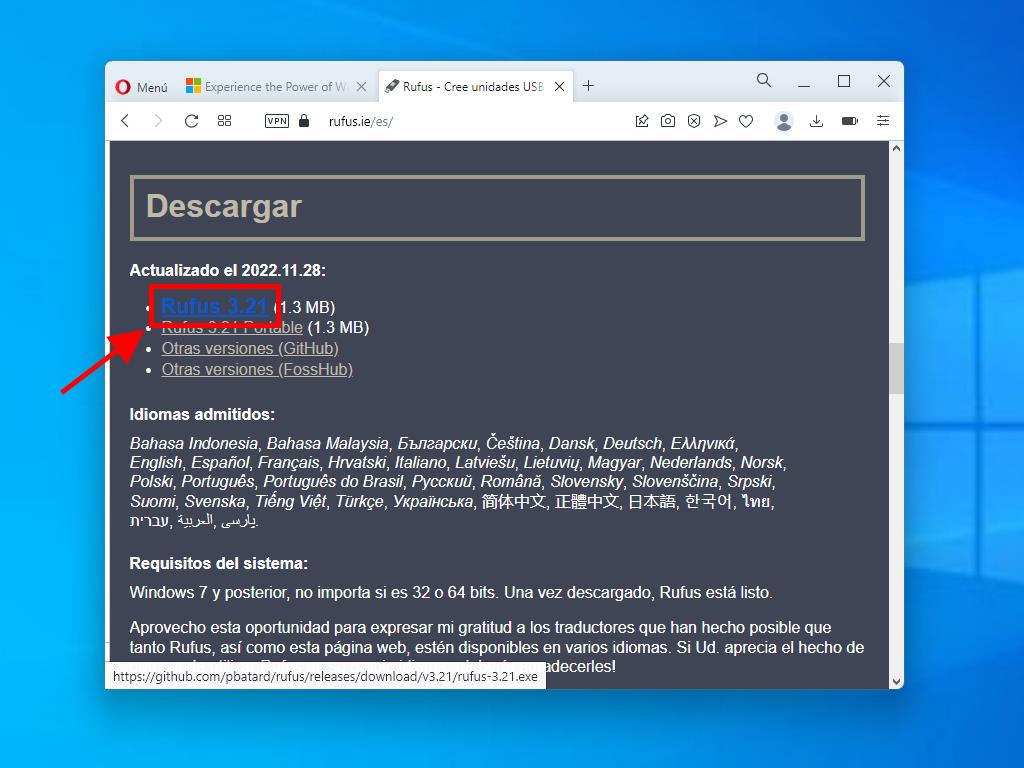- Desplázate hacia abajo y descarga la versión de Rufus más actualizada en la sección Descargar.