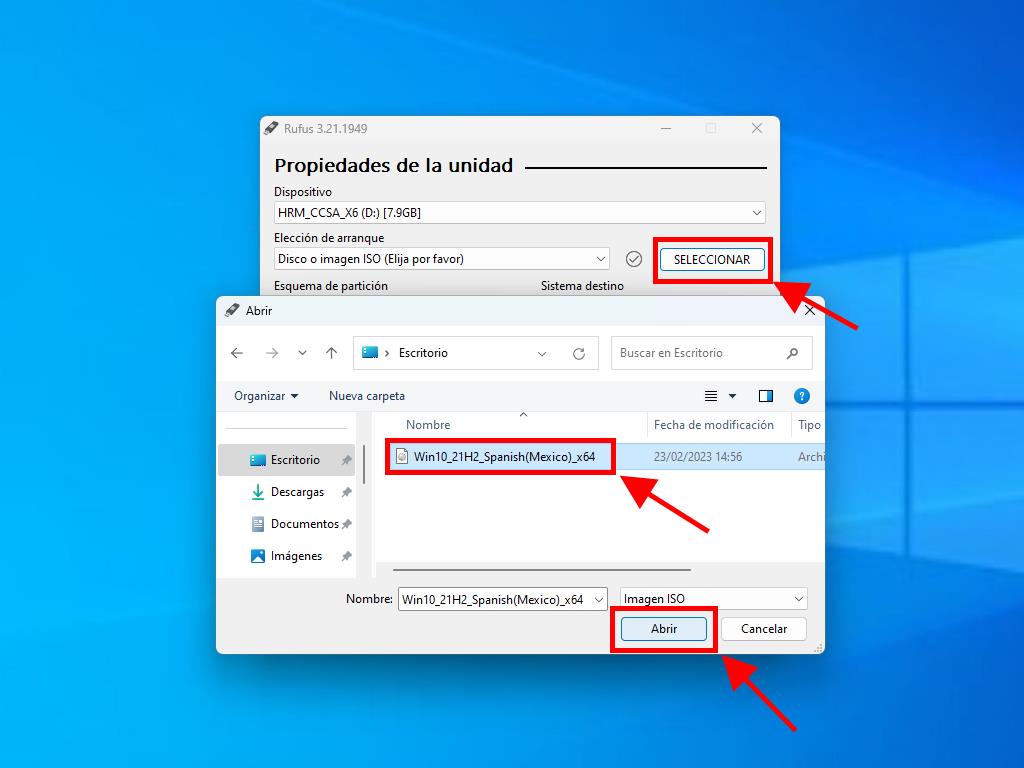 - Haz clic en Seleccionar y busca el archivo .iso de Windows 10 que deseas configurar.