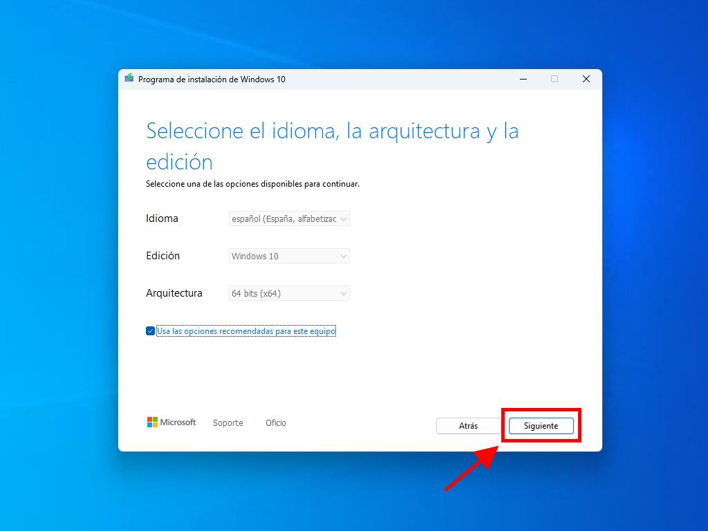 Nota: Si no estás de acuerdo con el idioma o con la edición de Windows desmarca la casilla usa las opciones recomendadas para este equipo y así podrás seleccionar el idioma y edición de tu preferencia.