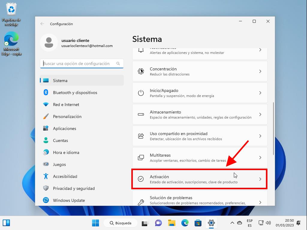 - Desplázate hacia abajo para encontrar la opción Activación y haz clic ahí.