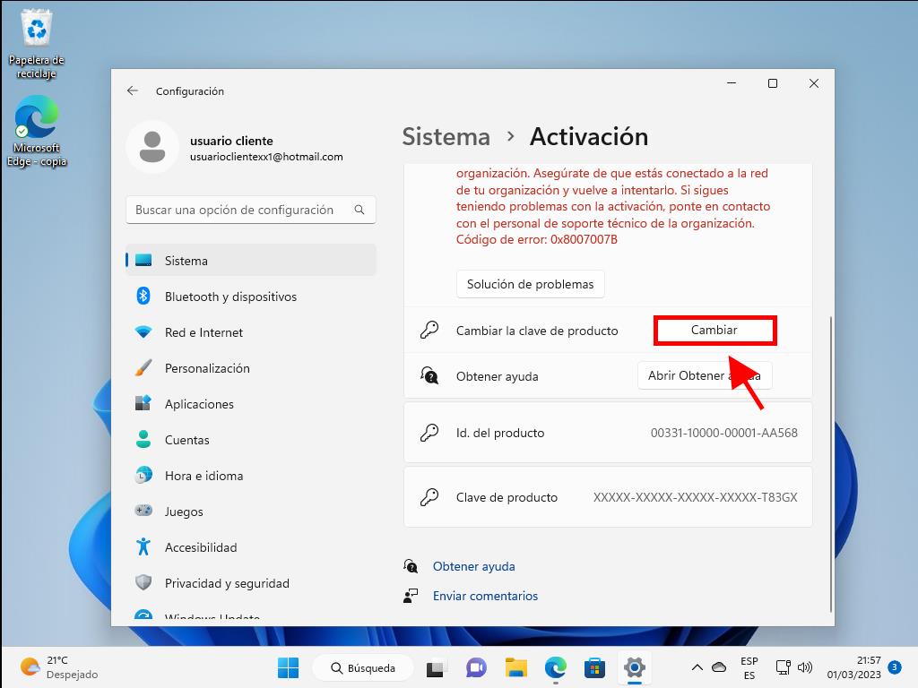 - Verás un menú desplegable con la opción Cambiar clave de producto.