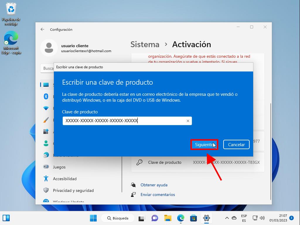 - Ingresa tu clave de producto de Windows 11 Pro.