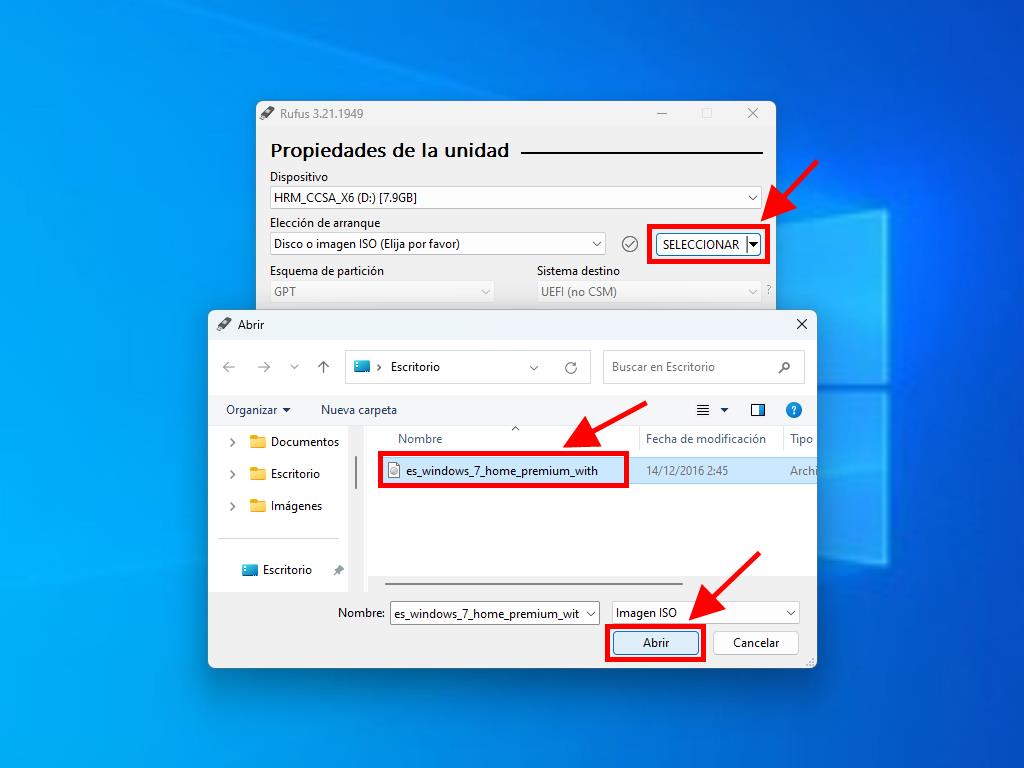 - Haz clic en Seleccionar y busca el archivo .iso de Windows 7 que deseas instalar.