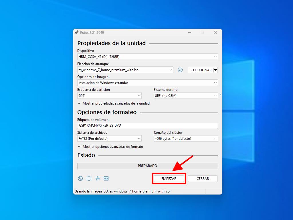 - Por último, haz clic en Empezar y espera a que el programa cree la unidad USB de arranque.