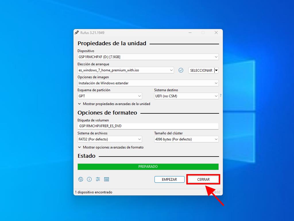 - Una vez finalizada la configuración (barra de progreso al 100%), haz clic en Cerrar y estará listo para instalar Windows 7.