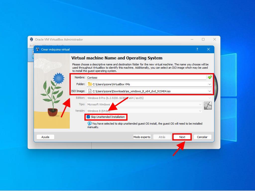 - Ingresa un nombre para la Máquina Virtual nueva y selecciona la ubicación del archivo .iso de Windows 8. Haz clic en Next.