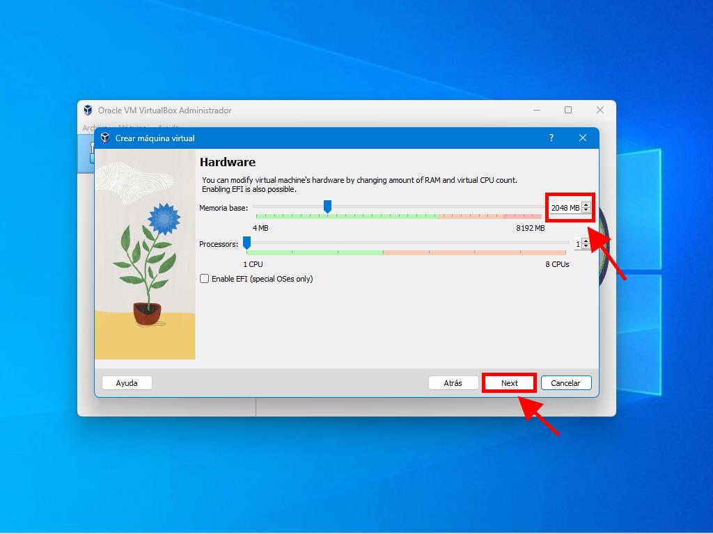 - Usa como mínimo 2 GB de RAM y haz clic en Next.